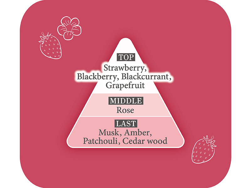 An elegant perfume whose top notes feature a combination of strawberry with the gentle sweetness of blackberry and blackcurrant, before gradually developing into rose and musk notes that emanate a sophisticated, feminine scent.