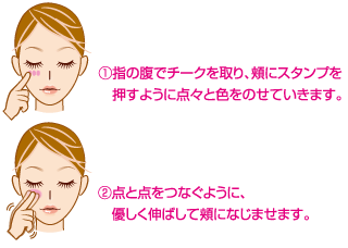 ①指の腹でチークを取り、頬にスタンプを押すように点々と色をのせていきます。