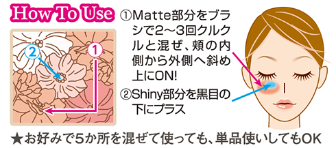 ①Matte部分をブラシで2~3回クルクルと混ぜ、頬の内側から外側へ斜め上にON!