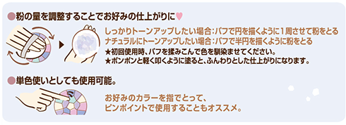 ★粉の量を調整して好みに仕上がりに しっかりトーンアップ⇒円を描くように1周 ナチュラルにトーンアップ⇒半円を描くように半周