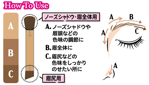 同系色で濃淡の異なる3色パウダーで構成されているので、統一感のあるグラデーション眉に仕上がります。