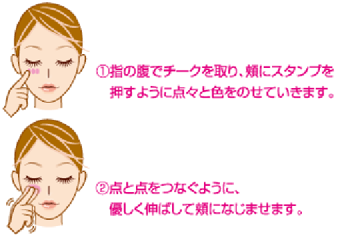 ①指の腹でチークを取り、頬にスタンプを押すように点々と色をのせていきます。