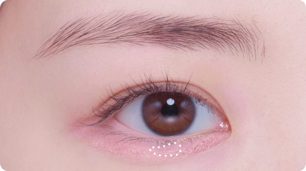 目頭まで入れると目元の印象がきつくなるので、目安は縦幅5mm、横幅は黒目の内側~目尻程度がぷっくりナチュラルに仕上がります。